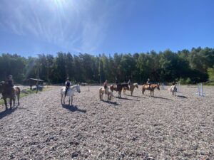 - Elementy ujeżdżania – jazda na padoku, wykonywanie zmian kierunku po zadanych torach, galop ze zmianami nogi, balans ciała.